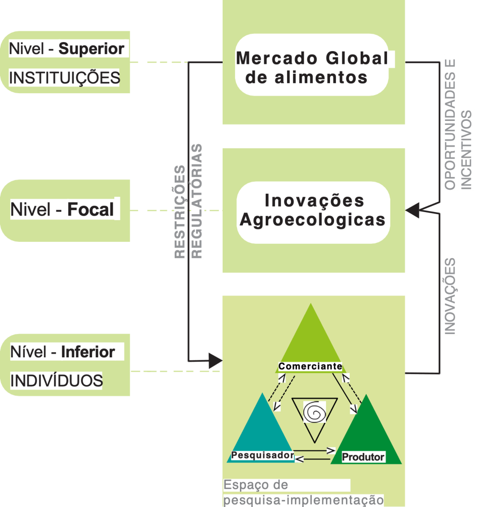 Figura 1: Modelo hierárquico em três níveis ilustrando a relação entre o mercado global de alimentos e a emergência de inovações agroecológicas. Essas inovações são testadas pelos agricultores, sob as regulamentações, restrições, oportunidades e incentivos do mercado global de alimentos (nível superior). O processo participativo, envolvendo agricultores, representantes da indústria de alimentos, e pesquisadores, exercem papel crucial na tomada de decisão sobre a adoção das práticas agroecológicas na agricultura (nível focal). Dentro do “espaço iterativo” (nível inferior) ocorre a coprodução de conhecimento pelos agricultores, representantes da industria de alimentos e pesquisadores, conduzindo ao desenvolvimento, implementação e usabilidade das inovações agroecológicas. Este processo de baixo para cima (bottom-up mechanism) promove a emergência de inovações agroecológicas com base cientifica e de fácil implementação (Adaptado de Salthe, 2010, 2012; Rocha & Rocha, 2018). Imagem desenhada por Germana Gonçalves de Araujo. Fonte: https:// doi.org/10.1002/pan3.10613