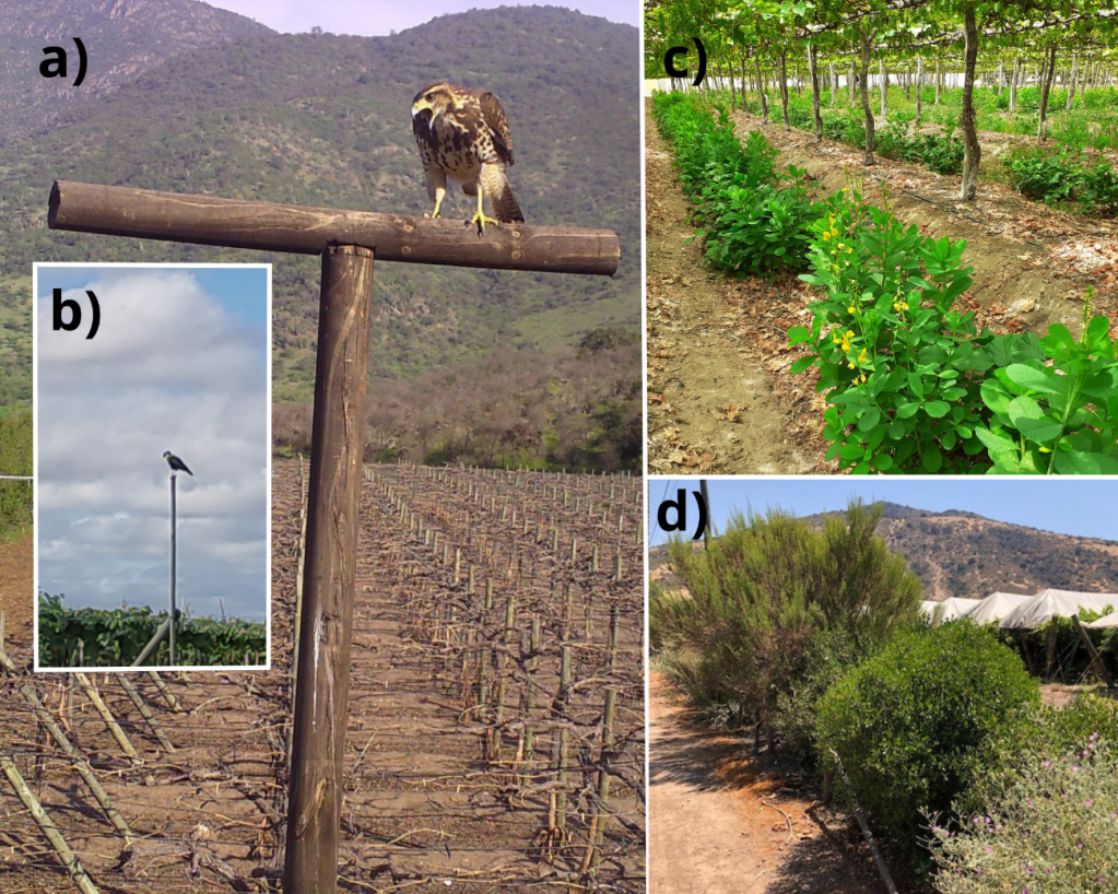 Figura 2: Inovações agroecológicas implementadas nas fazendas. Poleiros para aves usado pela espécie alvo: (a) “gavião” (Parabuteo unicinctus) fotografado com armadilha de camera no Chile; (b) “carcará” (Caracara plancus) fotografado por um produtor no Brasil; (c) cultivo de cobertura entre as linhas do vinhedo no Brasil e (d) faixa de planta nativa no Chile. Créditos da fotos: (a,d) Nadia Rojas- Arévalo, (b) agricultor participante anônimo, (c) Patricia Oliveira-Rebouças. Fonte: https://doi.org/10.1002/pan3.10613